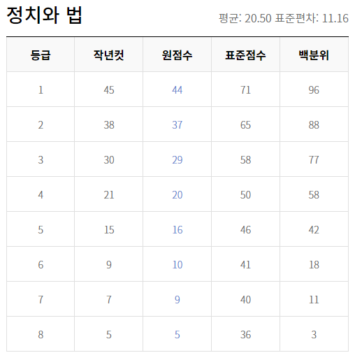 2022년 고3 4월 모의고사 정치와 법 등급컷 (2022년 4월 13일 수요일 시행).png